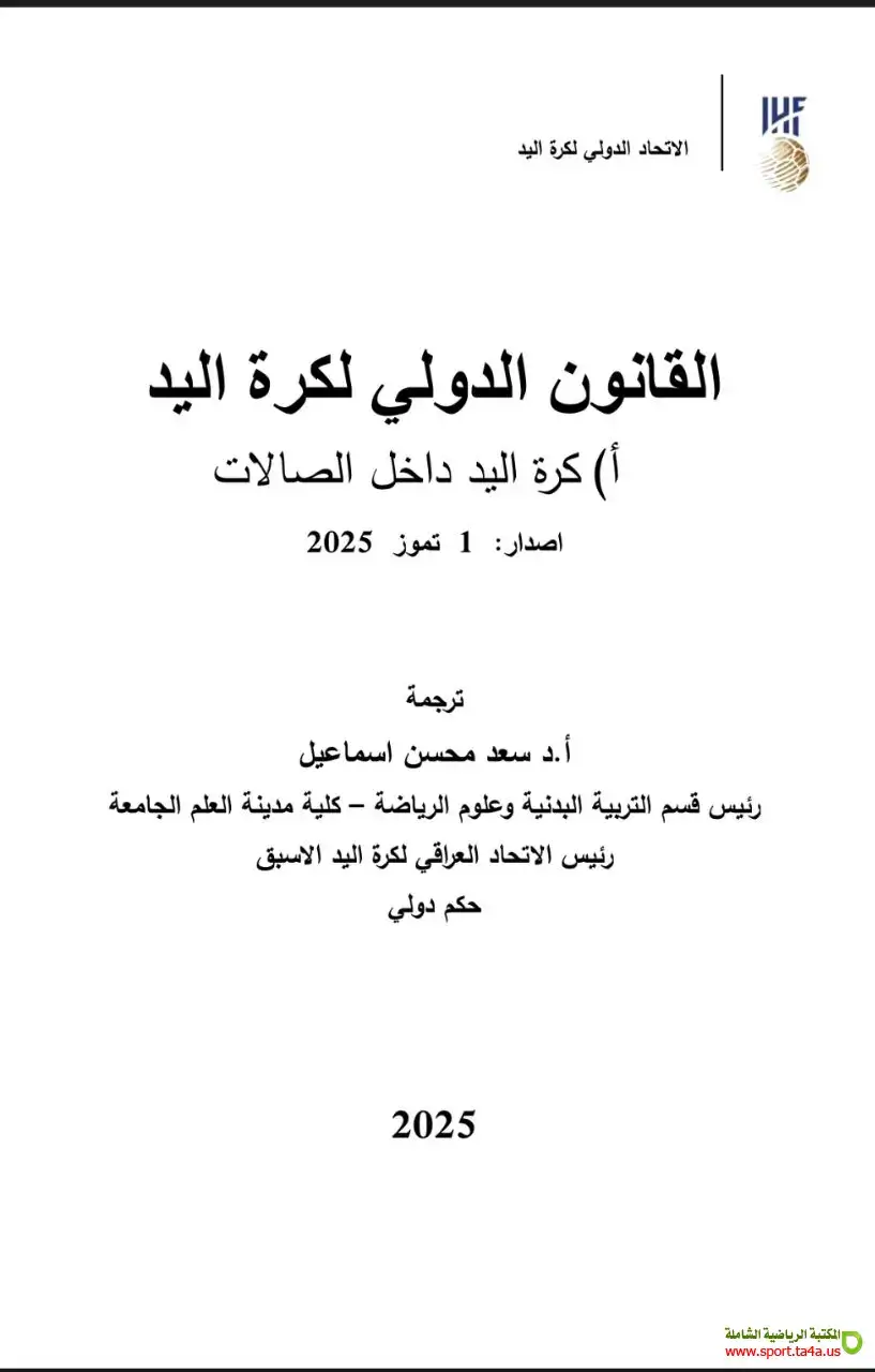 وفي هذا السياق، صدر حديثاً الكتاب الرسمي للقوانين الدولية لكرة اليد – إصدار 1 تموز 2025 بترجمة أ.د. سعد محسن إسماعيل، والذي يمثل المرجع الأساسي لكل من: